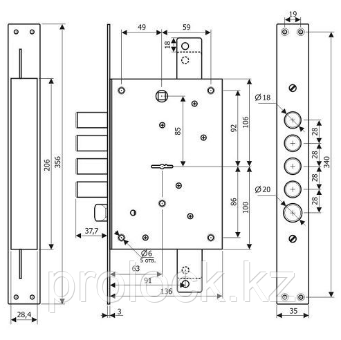 Замок врезной сувальдный под ручку, с выводами под тяги. Замок универсальный - переворот защелки выполняется без разбора замка (тип защелки - реверсивная). 3-й класс взломостойкости. Имеет 4 ригеля диаметром 18 мм (вылет ригеля 37,7 мм), съемную лицевую планку. Длина ключа 54 мм. Защита от наиболее распространенных методов вскрытия: защита от вскрытия отмычкой - ложные пазы на стойке и сувальдах, увеличенная жесткость пружин сувальд; защита от взлома – усиленная конструкция засова; защита от высверливания – закаленная стойка рейки хвостовика; защита от «свертыша» – ослабленный зуб рейки хвостовика. Предназначен для установки в металлические двери, шкафы и сейфы. Рекомендована комплектация с бронепластиной. .